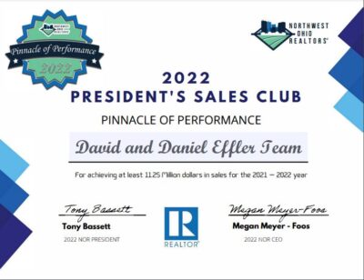 Effler Schmitt Co. is consistently named as a top sales performer, receiving annual industry awards from Northwest Ohio Realtors in recognition of outstanding sales achievements. David Effler and Daniel Effler have also earned the distinction of being in the top percentage of real estate agents within the Ohio Real Estate profession.